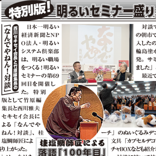 日本一明るい経済新聞とNPO法人・明るいシステム倶楽部は、明るい職場をつくる!明るいセミナーの第69回目を開催した。特別版として竹原編集 長と西川雅夫セキセイ会長による「なんでやねん!対談」、桂塩鯛師匠による落語「100年目」が披露され、会場は盛り上がった。